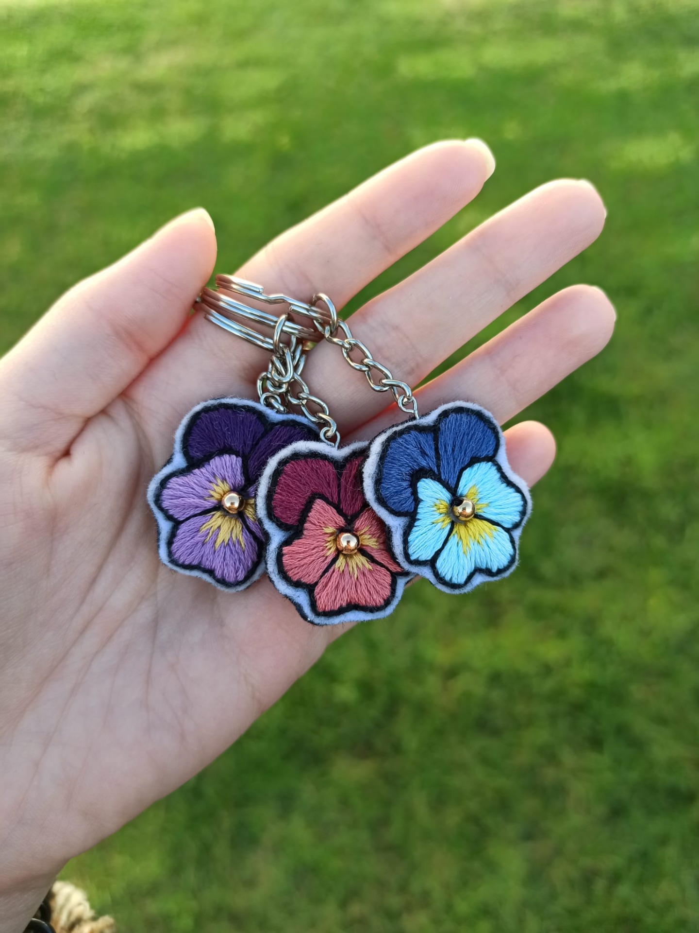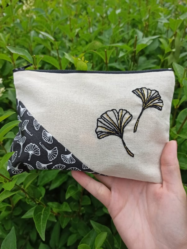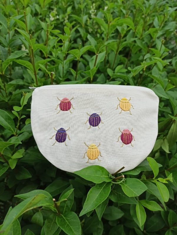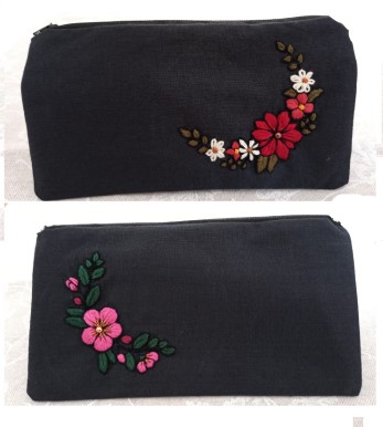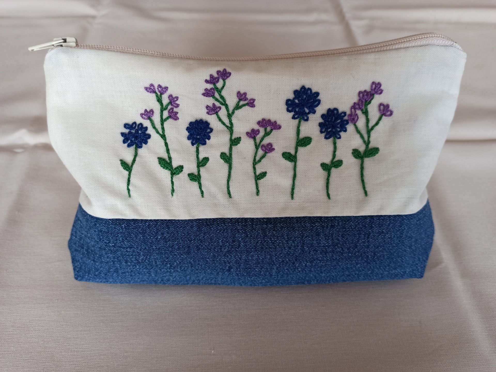 Barevná kvítka jsou vyšitá z obou stran pouzdra na krémově bílé bavlněné látce. Spodní, fialová část je taktéž z bavlny a je ušita tak, aby pouzdro stálo. Výroba trvala přes 10 hodin. Délka zipu je 20 cm.