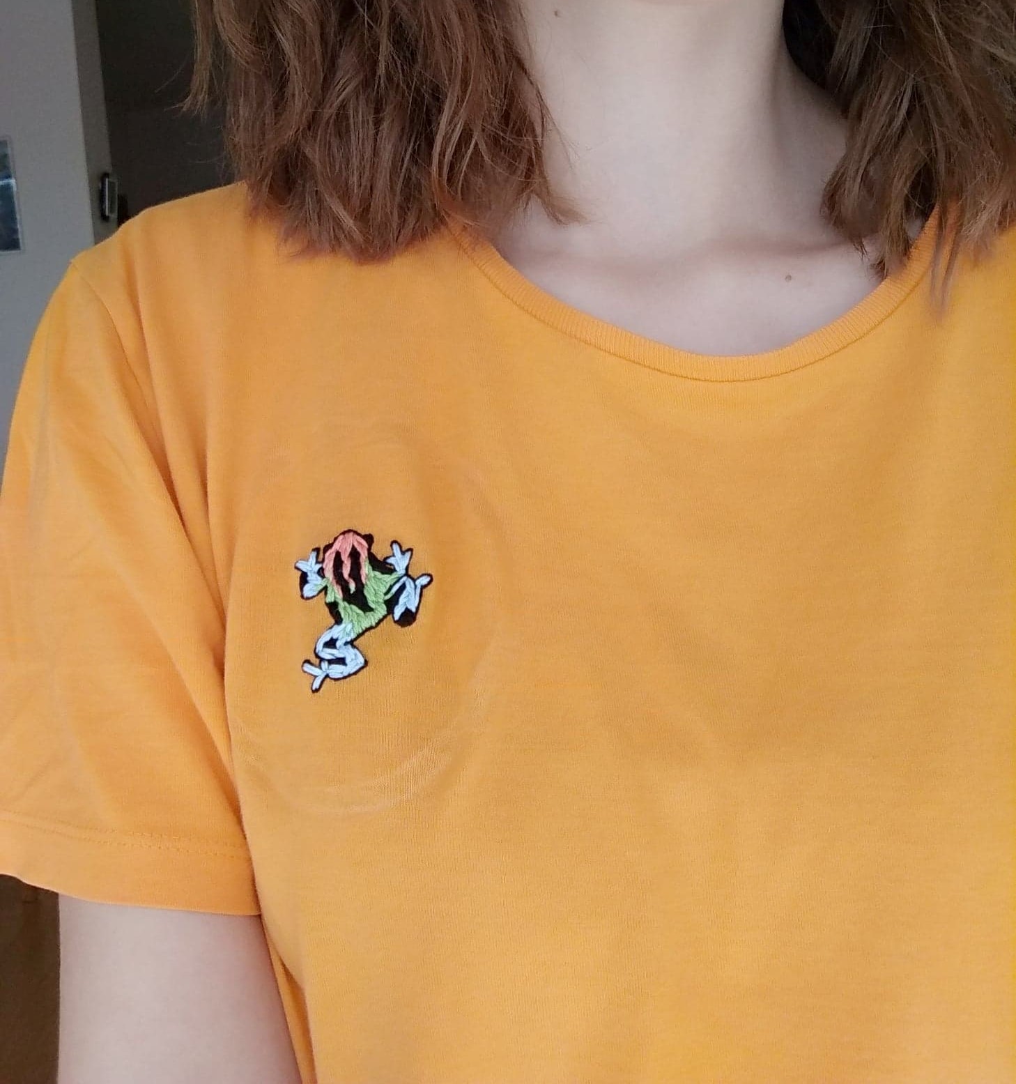 Pokoušela jsem se o pralesničku mnohobarvou. Použila jsem šablonku pro Žába 2 a barevně jsem se inspirovala obrázkem 4/9. Výšivka mi trvala přibližně 2 hodiny.